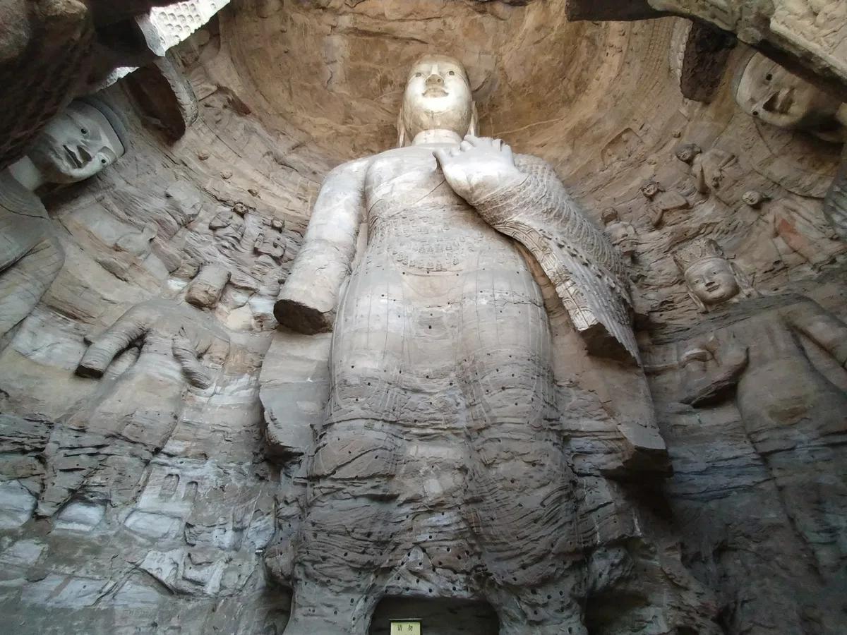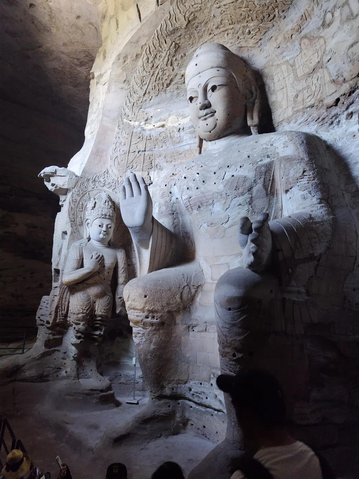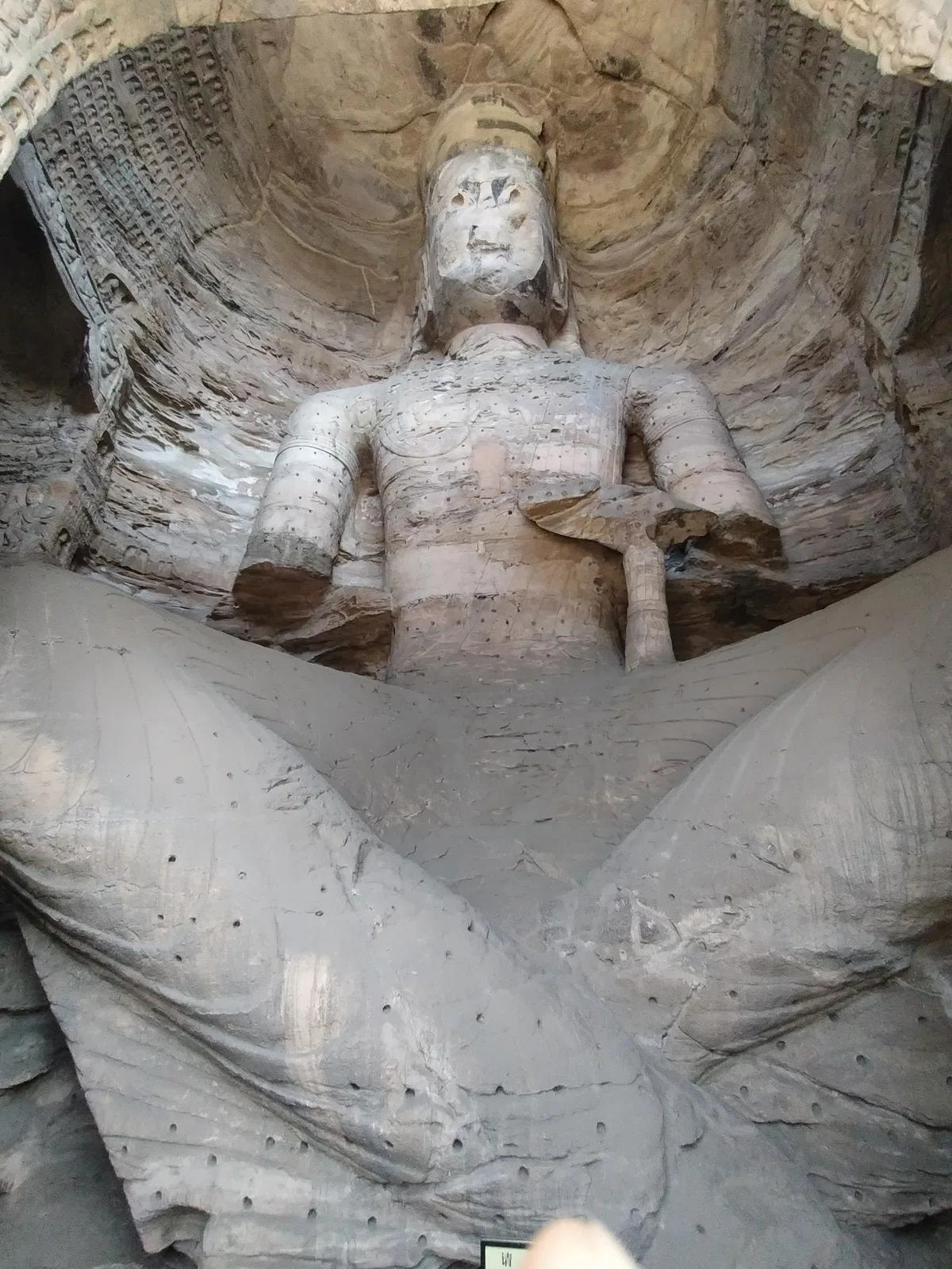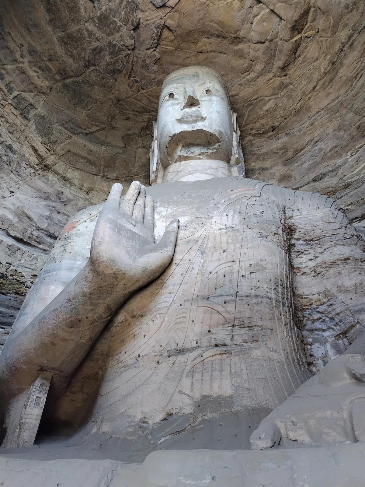 雲崗最大級の洞窟に座する本尊は高さ10mの阿弥陀如来。北魏時代には未完成で顔は200年以上後の唐時代に仕上げられました。そのため他の雲崗の他の仏像と容貌が異なっています。