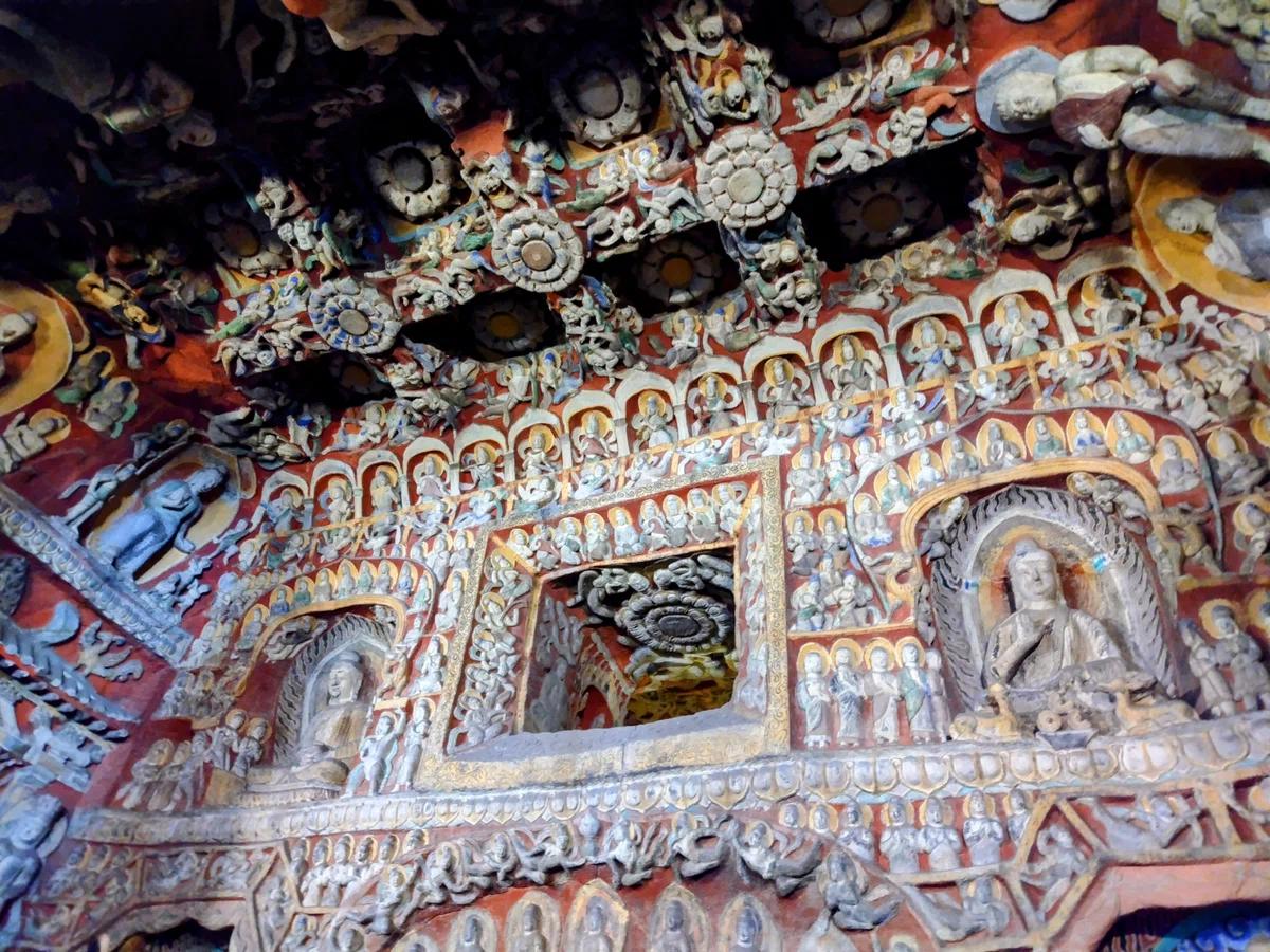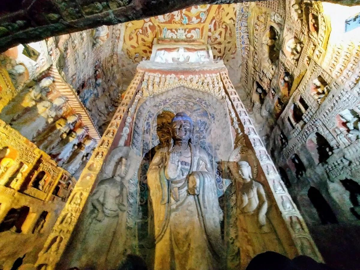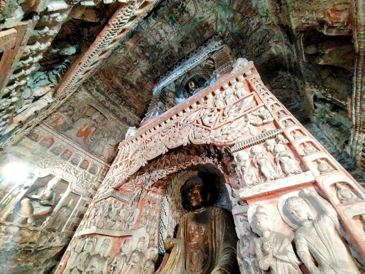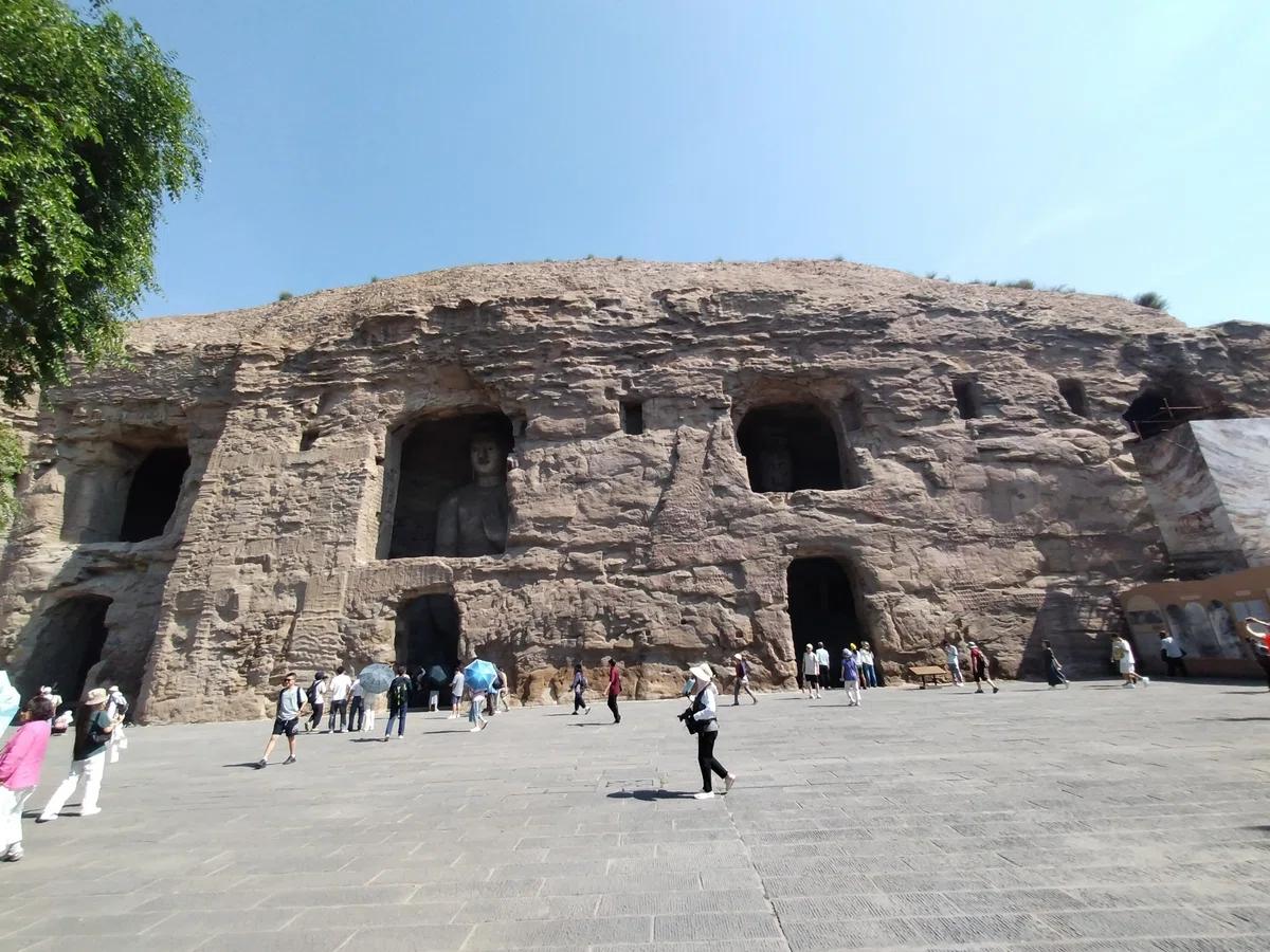 雲崗最大級の洞窟に座する本尊は高さ10mの阿弥陀如来。北魏時代には未完成で顔は200年以上後の唐時代に仕上げられました。そのため他の雲崗の他の仏像と容貌が異なっています。