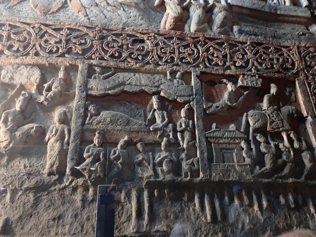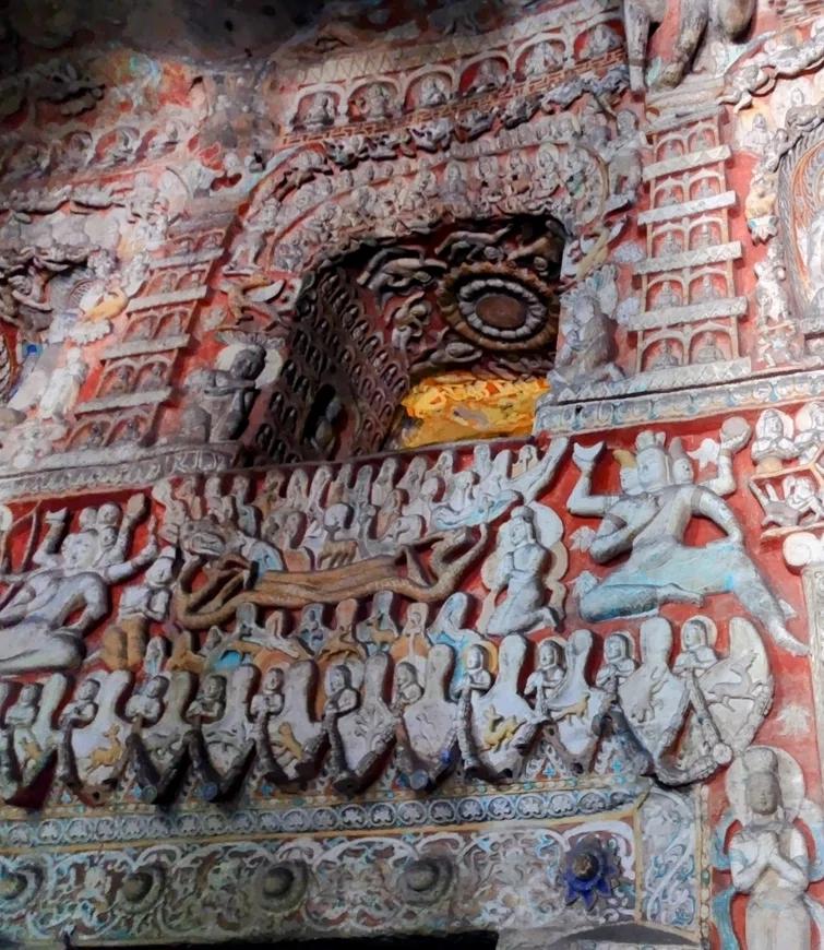 緻密な設計で完璧な仏像構成だと称えられる第18窟。中央に巨大な主尊を据え、左右対称に、大きさの異なる脇侍、菩薩、弟子を配するこの配置は、整然とした階層構造と完璧な構成を持つ古典的な絵画を形作り、極めて神聖で荘厳な宗教的雰囲気を醸し出しています。