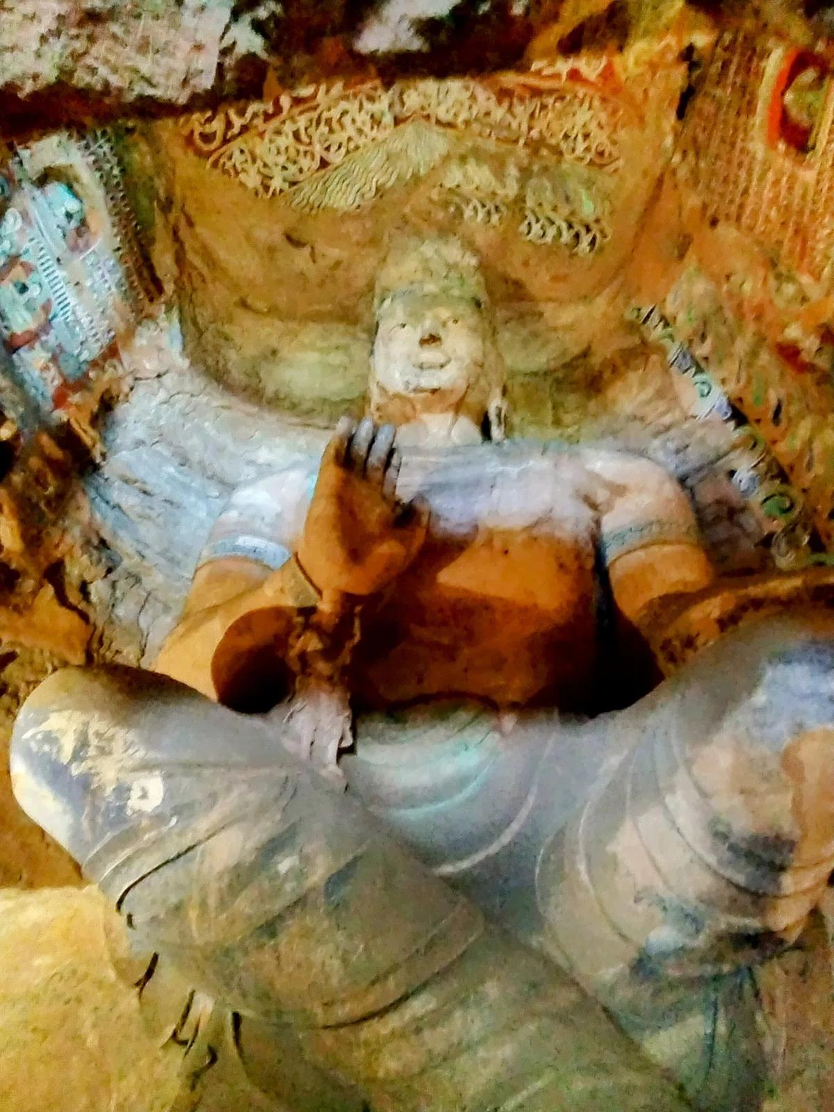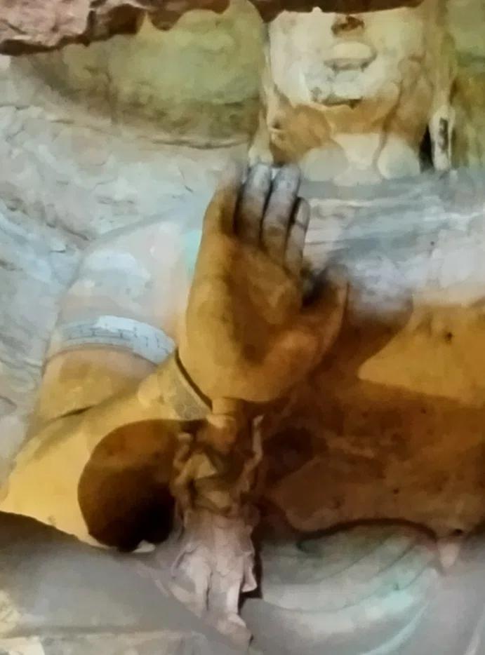 第13窟の菩薩像は右手を上げて勇猛果敢な姿勢をとっていますが。そのあまりに巨大な姿のため、中空に保つことができませんでした。