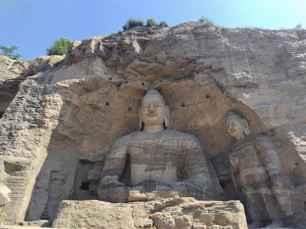第20窟は正面の壁が崩落したため、仏像が露出しており「露天大仏」と呼ばれる。大仏の荘厳な姿は初期雲岡石窟彫刻の典型的な特徴を体現しており、この時代を代表する仏像。